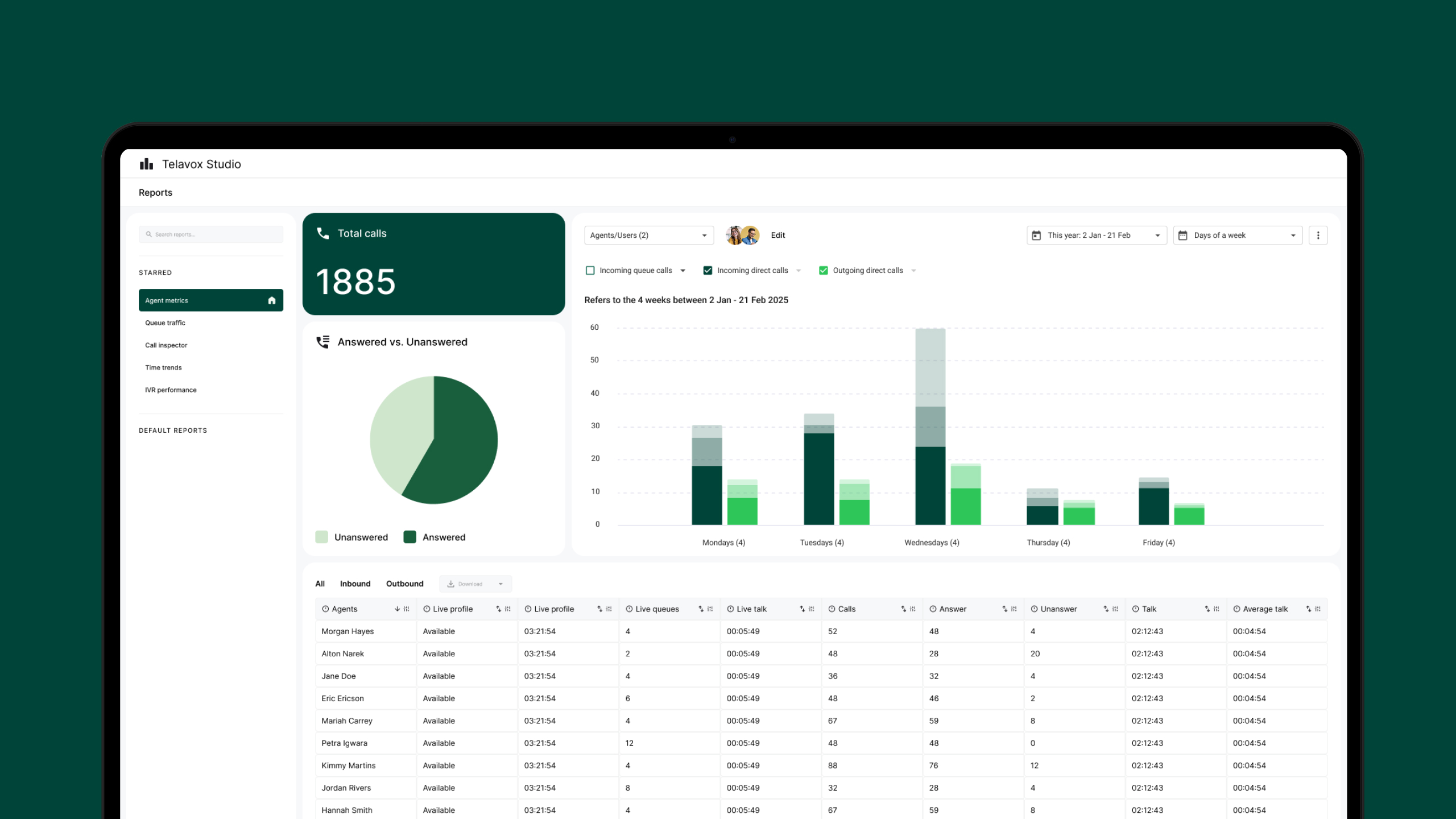Telavox Studio is used when the telephone is a central part of the work and there is a need to continuously monitor queues, load and availability. It is suitable for teams working with support, customer service, sales or booking and who need a clear picture of how calls are handled, day by day.